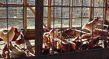 ここは鶏密度も低く広びろ、 おまけに日当たり・風通しとも最高!! 日向ぼっこでもしているのかと思いきや、 上の写真のように整列して水を飲んでいたのでした。 |