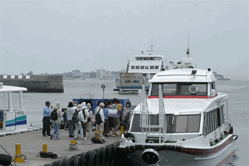 師崎港の高速船、 日間賀島行き。 奥は日間賀、 篠島から戻ったフェリー。 沖に見える島は日間賀島。 |
