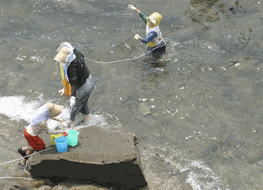 | 何を採っているのか? 命綱を着け海に入る女性達 |