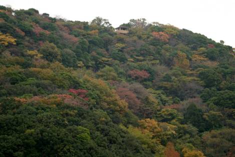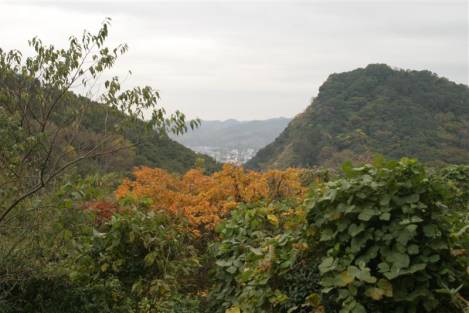 | 臭木の赤い実や鮮やかな黄色の花を咲かせたツワブキなど里山を楽しみながら15分ほど歩くと小野浦海岸に出ました。塩の館でしばしの休憩を取り内海へ。前号で音吉漂流記を取り上げましたが、その漂流者達の菩提寺、良参寺や三吉達の偉業を称えた頌徳記念碑前を歩き、“青少年自然の家”の前を抜け、また山道に入ります。 この道は、紅葉に色づいた周囲の山並みが見え秋の散策路として最高! 目的の“知多半島の紅葉”を眺めることが出来ました。 |