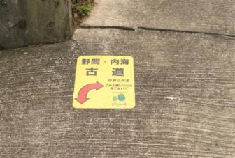 | 瑞境寺から富具崎公園に向かい伊勢湾を望みましたが、この日はあいにくの曇り、セントレアも霞の中に僅かに見える程度でした。天気がよければ鳥羽も見える眺望とのことです。 吉祥寺をへて細目地区から山道に入りました。 12日には気付かなかったのですが、山に入る野池の前に古道の目印がありました。 そこから内海の駅に至るまで、道を誤りそうな交差点に、ルートを表すこのシール(左下写真)が必ず貼られていました。 |