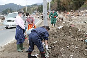 東京から来たボランティアグループで、左の方は、キリスト教会の牧師さんでした。 「こんなひどい状況で、手で作業してこれがどれだけ役に立つんだと思ったりもするんです。」と女性の方がいわれました。 男性の牧師さんがにこやかに 「万里の長城も人の手でつくったんです。ここだって、できないことはありません」と言われました。妙に納得しました。自分自身、焼け石に水みたいな気分になっていたものですから・・・