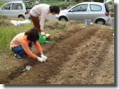 | 5月27日 さつまいもの苗を植えました。この日は、高 校生も手伝ってくれ、急ピッチで畝作り。とは いえ、例の根っこ処理に時間がかかり、2本 が限界。それなのに、苗は80本もある。無理 して55本を植えたものの、間隔にちょっと難 有り・・?「まぁ、いいか」と納得したものの、 秋にはどんな芋がとれるやら・・・・・。 もしかして、新種の芋になってるかも・・・? |