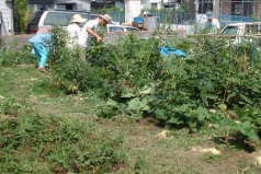 この日は熱心に草取りをしてしまった。 ”してしまった・・・”というのはどうしてか? もともと雑草の根は水分を蓄えてくれる。 必要以上に抜くことはなく、雑草とも上手く付き合っていくことが 楽しく農作業をするコツ。(除草剤は絶対使わない事) ところが、一度草を抜き始めると、ついつい大掛かりな除草をしてしまう。 この日の作業もそうだったかもしれない。 少し前までは、除草の常識は「根っこから引き抜く事」だと思っていたから 無理もないが、 「必要以上の除草は土の乾燥を招き、作物に負担をかける」らしい。 暑さの中、敵のように草を抜かなくてもいいわけだが、なすの1件もこの抜きすぎが原因かも・・・・。 |