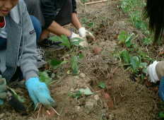 10月21日 さつま芋の畝は2本。1週間後の”焼き芋パーティー”用のため、1本だけ先行して掘り起こす事になった。 この日は、大人たちだけの作業となったが、恐る恐る土を掘り起こすと鮮やかな赤紫色をした物を発見! その姿は紛れもなく”さつま芋”で、1本目の芋を取り出した瞬間、 「わぁー!!」と歓声があがった。 |