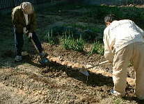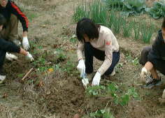 | 10月28日 この日は、残り1本の畝を子供たちが中心になり掘り起こした。 土がやや粘土質の為、1本堀り出すのに悪戦苦闘!しかし、午後からある焼き芋パーティー”働かざるもの食うべからず!”。大人たちの叱咤激励の中、彼らは頑張った。 |