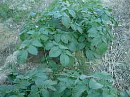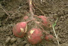 いくつか掘り出していると、芋のつき方がまるで人間社会のようで面白かった。 大きな芋が陣取り、離れた所に小さな小さな芋が申し訳なさそうに付いている物があると思えば、左の写真のように、5〜6個の芋が肩を寄せ合い”団結してるぞ!”って感じのものまで。 中には、芋なのか?根っこなのか?”あんたは何なの?”という正体不明なものまで。 いも社会にもストレス発生か!? |