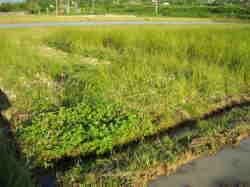 これが、不耕起。 読んで字のごとく、田を耕さず起さないで植付けをしていきます。 肥料になるものは自然に生えた草やワラ そのまま倒したり刈ったりして 土に返していくだけです。 草を抜かない、だけじゃなかったんです。 大変ですが、人力で行います。 それで野田さんたちはこのような農法を 自然農と呼んでいます。 これを、私の師※川口先生は20年も前から続けてこられ、私はまだ10年。 土の状態はまだまだ先生には及びませんけどね。 でも、水は要らないんですか?これじゃ畑じゃないですかと 心配した私たちにこんな解説が。 私も、毎年心配してるんですけどね、 でも不思議とちゃんととれてますからね 一般的な田に水を張る理由は @保温A水草以外の草が生えにくいB農薬が使いやすい 野田さんの田ではこれらの理由は当てはまらず、 イネの生育条件に合わせて、田植え後にもう少し水を入れるそうです。 |