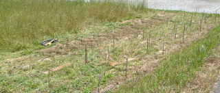 | 古いイネの切り株が残っていました。(写真中央下) その間あいだに苗を植えていきます。 今年は例年より小さい苗(約10cm)です。 |