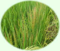 | 野田さんの解説「出穂が始まってからは稲の根を切るといけないので あまり田んぼの中に入っていませんので いろんな草たちが成長してきました。 稲の穂が出る頃には根が四方八方に張って 根も葉も子孫(籾)作りのみに全力を尽くしています。 田んぼへ入ればその根を切ってしまいますが新しい根を作る余裕はありません。 それで穂が出たらできるだけ田んぼに入らないようにします。 稲の根を切る効果があるのは幼苗の時です。 田植えの時苗床から苗を取ると必然的に根を切ってしまうことになりますが 稲が危機感を持つのか新しく太い根を出してそのほうがずっと強健に育ちます。 直播きの稲より移植した稲のほうが茎が太く分けつも多く穂も大きくなります。 すずめはお米よりひえを好んで食べるともいいますし 虫害のことも考えて 出穂の後の草は自然にまかせています。」 |