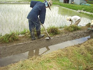 | あぜ塗りは水が漏れないように田んぼの下のあぜを、 こねた田の土で壁を塗るように塗るものです。 大変な作業ですので最近はあまり見かけません。 私も横着をして、あぜ塗りをしたことはありません。 |