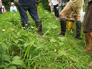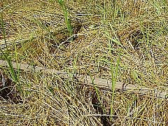 | 左右の草は腰まであったイネ科の草が実を結んで倒れかけたところです。 我が家の田んぼにも同じ草が生えていましたが、川口さんの田んぼでは草の量が我が家の田んぼの2倍くらいあるように感じました。 |