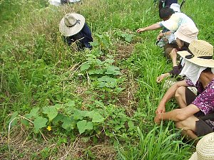 | 大豆は、ハトに食われないように草の中に蒔き、 本葉が出たら草を刈ります。 |