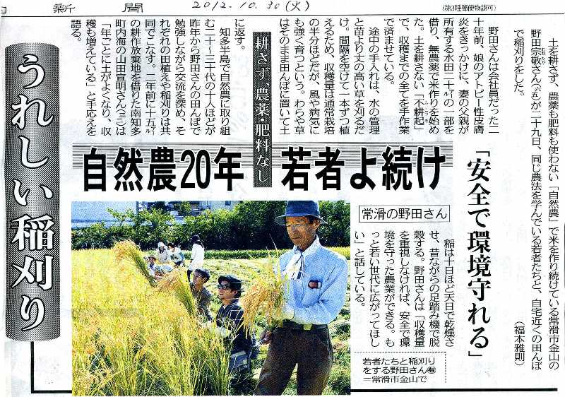 | 自然農学びの場 『汐見坂自然農園』 のご案内 三十数年前、奈良県の川口由一さんが、田畑を耕さず虫や草を敵とせず 農薬、肥料を必要としない「自然農」を始められました。 自然の営みに沿ったその生き方に、年齢性別を問わず多くの人々が共鳴して 全国各地で自然農学びの場が開かれるようになりました。 『汐見坂自然農園』では、田畑の見学、実習を通して 一緒に自然農を学んでいきたいと思っています。 農作業の経験があるなしにかかわらず、どなたでも参加できます。 安らかで楽しい農的生活ができますよう心から応援します。 田畑(水田1ヶ所と畑2ヶ所)を区分けして学びの場としてやってもらうことは難しいので、しばらくは私と一緒にやってもらい、自信がついたらそれぞれ自分たちの田畑で自立してもらおうと思っています。 十分にはできませんが、私のできる範囲でやらせてもらうつもりです。 関心のある方はお問い合わせください。 今年も若者たちに助けてもらい、脱穀、収蔵まで終わり、ほっとしています。 まだ他の皆さんが終わっていないのでこれからできる範囲でお手伝いに行こうと思っています。 現在、田んぼの実習をしたいという人が3〜4人いて、私たちも2反の田んぼを2人で 管理するのが難しくなってきたことから、半分の1反を区分けして皆さんに使ってもらおうということになりました。 参加費用は無料の予定です。 実習用なので多くの面積を提供することはできませんが、やってみたいという人がいればご連絡ください。 (2012.11.12) 。。。。。。。。。。。。。。。。。。。。。。。。 汐見坂自然農園 野田 〒479-0003 常滑市金山字金蓮寺?丁目-?番地 電話 43-4722 。。。。。。。。。。。。。。。。。。。。。。。。 ※E-MAILの場合はまず、当サイト事務局へお送りください。転送させていただきます。 ![]() |