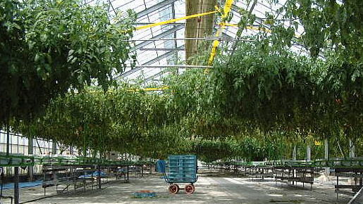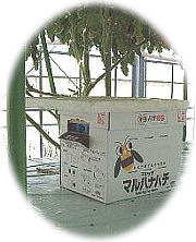 | 右は蜂のハウスです。 トマトの花の受粉のため、蜂がこの広い温室の中を飛び回ってせっせと働いていました。(※ホルモン剤処理をするところもあるそうです。) このハウスのVIPルームには、女王蜂もいるとのことでした。 |