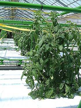 約2000u(600坪)--- もの広さの温室に 約70本(栽培ベット数が70)のトマトの木--- 茎の直径は太いものは20センチにも--- が枝を広げていました。 |