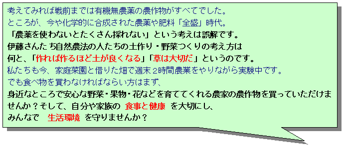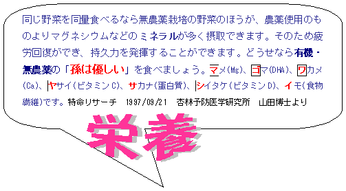 ■産地や栽培方法を見て買いましょう。 ■化学合成農薬、化学肥料、化学合成土壌改良材を使わないで、3年以上を経過し、堆肥等(有機質肥料)による土づくりを行った田畑で収穫された農産物につけられるマークです。 ただし、この認定を取る為には、数万円から十数万円のコストが毎年農家にかかってきます。日本のような小さな規模の田畑で生産している良心的な農家は認定マークを取ることは非常に難しいと考えています。 ■表示制度が2001.4.1スタートして一年余。2002.6月岡山県の豆腐メーカー「フージーファクトリー」が有機JASマークを不正につけて販売したことがわかり、認定を取り消された。認定制度設置後初のケースということです。 同じく6月に有機JASマークがついた中国・山東省の「泰安泰山亜細亜食品有限公司」が製造した冷凍ほうれん草から食品衛生法に定められた残留農薬基準を超える農薬が検出されました。 認定マークにだけに頼らず身近な農家の実際を見て購入してください。 |