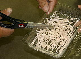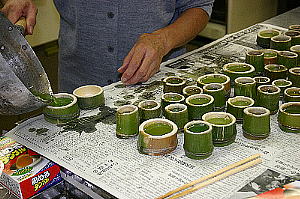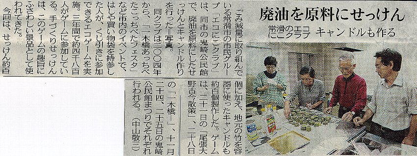 ・本日の例会-石けんの裁断と包装作業。キャンドル作り。中日新聞の取材