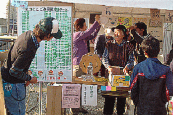 景品は市内のごみゼロ推進店さんはじめ事業所やグループ、個人の方の協力を得て、極力廃材で作った製品、手作り品や死蔵品などの「エコグッズ」を集め、くじをひいた人がその景品の中から極力選べるように工夫しています。