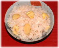 ![]() 栗 ・・・300g <米> 米 ・・・2カップ もち米 ・・・1カップ 水 ・・・3と1/3カップ <調味料> 塩 ・・・小さじ 1.5杯 しょう油 ・・・大さじ 1杯 砂糖 ・・・大さじ 1杯 酒 ・・・大さじ 2杯 ※塩味だけの方は色がきれいで栗の甘みが増すが、醤油味の方は色が栗にもご飯にもつくが冷めてもおいしい。 ※酒のかわりに同量のみりんでもOK |