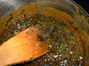 シソ味噌![]() 1.青シソをきれいに洗って、千切りにする。(少々硬い葉っぱも大丈夫−約200g) 2.これを少量のサラダオイルで炒める。 3.ここにザラメと味噌を同量、300g入る。(味をみて整える) 4.ゆっくりと中弱火でくつくつ煮込む。 全体の量が半分以下になるまでゆっくり煮込んで出来上がり。 甘くて、しょっぱくて、シソの香りもたっぷり!! アツアツのご飯にのせる。 ちょっとお酒でのばしてお魚にぬって焼く。 日持ちもするので、お弁当にもOK 焼きおにぎりにぬって焼く。 葉シソ味噌 1.青シソをきれいに洗って、広げる。 2.味噌、しょう油、ごま油、すりごま、七味唐辛子、豆板ジャン、(砂糖)をブレンドして軽く火にかけた味噌をさます。 3.シソの葉にひろげてシソの葉でサンドし、冷蔵庫で保存する。 冷凍保存する。 炒め物、豆腐のたれ などに使う。 |