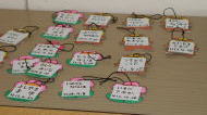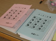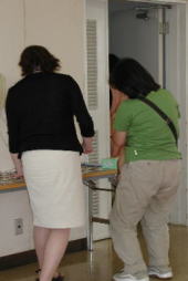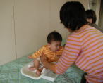 | 「名札 どこかな〜」 保健師さんがお手伝い 〔すくすく広場〕手帳 出席シールを貼ります。 |