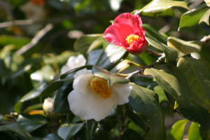 ![]() 美浜町、野間の一つの枝から紅白の椿 |