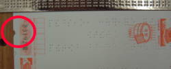 官製はがきにも盲人用があります。 どちらも、このくぼみではがきの裏表、上下がわかるようになっています。読むときにくぼみが右上になるようにします。(打つときは左の上) 右から左へ横に打ちます。 |