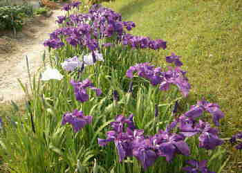 ![]() 丘陵地帯に開かれた畑の傍道に咲く 杜若(カキツバタ) |