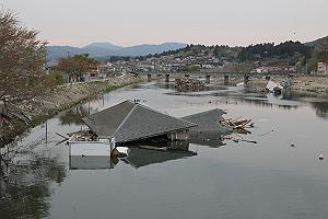 南三陸町から気仙沼に入りました。 入るとすぐに川があり、5月だというのに桜は満開でした。さすがは東北。それだけ気温が低く桜前線はこんなに違うのです。そして、堤防の堤も桜も自然も、何事もなかったかのよう。 けれども、左側の川にゴミのように見えますが、車や家の壊れた残骸です。