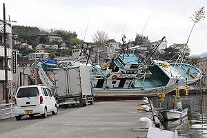 港から町の中へ入ったところです。坂の上に商店が残り、そこへ買い物に行った住人の方です。買い物袋をさげ、家に食料を運んでいます。
