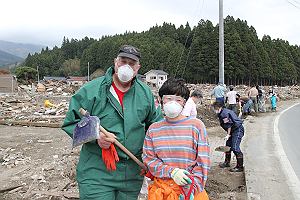 東京から来たボランティアグループで、左の方は、キリスト教会の牧師さんでした。 「こんなひどい状況で、手で作業してこれがどれだけ役に立つんだと思ったりもするんです。」と女性の方がいわれました。 男性の牧師さんがにこやかに 「万里の長城も人の手でつくったんです。ここだって、できないことはありません」と言われました。妙に納得しました。自分自身、焼け石に水みたいな気分になっていたものですから・・・