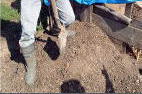 | 伊藤さんの畑の堆肥土つくり第1次発酵場(写真左)第2次発酵場(写真右)を見学 畳1帖分ぐらいか? 微生物を紫外線から守るビニールシートの中土は ・乾いてサラサラの細かい粒の土 ・なんとなく懐かしく優しい気持ちになる匂い ・触ると温かい いずれも、好気性の微生物が活発に働いている証拠 ![]() ![]() |