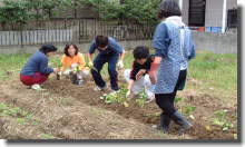 | 5月27日 さつまいもの苗を植えました。この日は、高 校生も手伝ってくれ、急ピッチで畝作り。とは いえ、例の根っこ処理に時間がかかり、2本 が限界。それなのに、苗は80本もある。無理 して55本を植えたものの、間隔にちょっと難 有り・・?「まぁ、いいか」と納得したものの、 秋にはどんな芋がとれるやら・・・・・。 もしかして、新種の芋になってるかも・・・? |