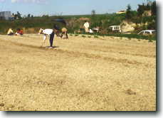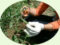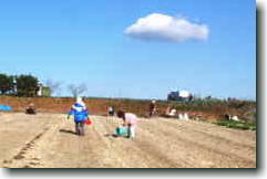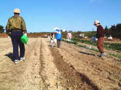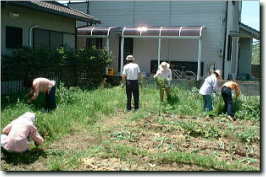 第1畑と比較すると、その広さは およそ100倍。 村民一同、「広〜い!」を連発。 広くなった分、作業量は増すが、 無農薬を目指した収穫への夢は どんどん膨らんでいった。 |