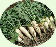 ちょっと小ぶりですが、「おしん」 という大根です。葉っぱも味噌汁の具や 炒め物にして無駄なく利用。 |