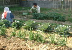 日曜日、おしゃべりに夢中になりながらも、畑仕事に精を出す。