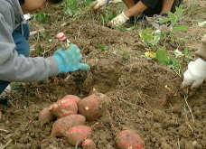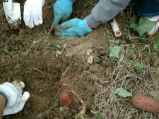 10月21日 さつま芋の畝は2本。1週間後の”焼き芋パーティー”用のため、1本だけ先行して掘り起こす事になった。 この日は、大人たちだけの作業となったが、恐る恐る土を掘り起こすと鮮やかな赤紫色をした物を発見! その姿は紛れもなく”さつま芋”で、1本目の芋を取り出した瞬間、 「わぁー!!」と歓声があがった。 |