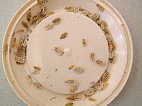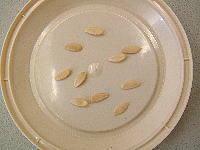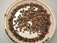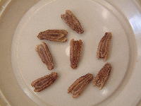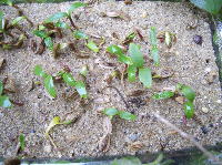 ■蒔きどき-5月初旬 ■04/09/ 市内在住の中野さんからいただいた苗から採取 ■この小さな緑色の種、何だと思いますか? ■発芽させるのはむずかしいとのことですが、たくさん芽がでました。しかし、土が悪いのかあまり大きくなってきません。 |