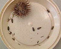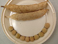 ■蒔きどき-6月初旬 ■2004/10 食用に買ったものを蒔いたものから採取 ■一畝分(20粒位)だけまいてみました。初めて蒔いた種が育ち、黄色い花をつけ、やっと実を結び、虫に狙われることもなくきれいに完熟したものから採取していきました。それが、全部で小さな海苔の佃煮の瓶に一杯ぶんくらい。DASH村の仲間とぜんざいにして食べるには少なすぎ ■ソラマメの種はこの虫に食われても発芽すると聞いたことがあります。こうなったら蒔くしかありません。 |