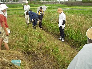 | 左右の草は腰まであったイネ科の草が実を結んで倒れかけたところです。 我が家の田んぼにも同じ草が生えていましたが、川口さんの田んぼでは草の量が我が家の田んぼの2倍くらいあるように感じました。 |