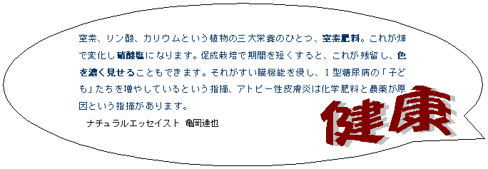 ■産地や栽培方法を見て買いましょう。 ■化学合成農薬、化学肥料、化学合成土壌改良材を使わないで、3年以上を経過し、堆肥等(有機質肥料)による土づくりを行った田畑で収穫された農産物につけられるマークです。 ただし、この認定を取る為には、数万円から十数万円のコストが毎年農家にかかってきます。日本のような小さな規模の田畑で生産している良心的な農家は認定マークを取ることは非常に難しいと考えています。 ■表示制度が2001.4.1スタートして一年余。2002.6月岡山県の豆腐メーカー「フージーファクトリー」が有機JASマークを不正につけて販売したことがわかり、認定を取り消された。認定制度設置後初のケースということです。 同じく6月に有機JASマークがついた中国・山東省の「泰安泰山亜細亜食品有限公司」が製造した冷凍ほうれん草から食品衛生法に定められた残留農薬基準を超える農薬が検出されました。 認定マークにだけに頼らず身近な農家の実際を見て購入してください。 |